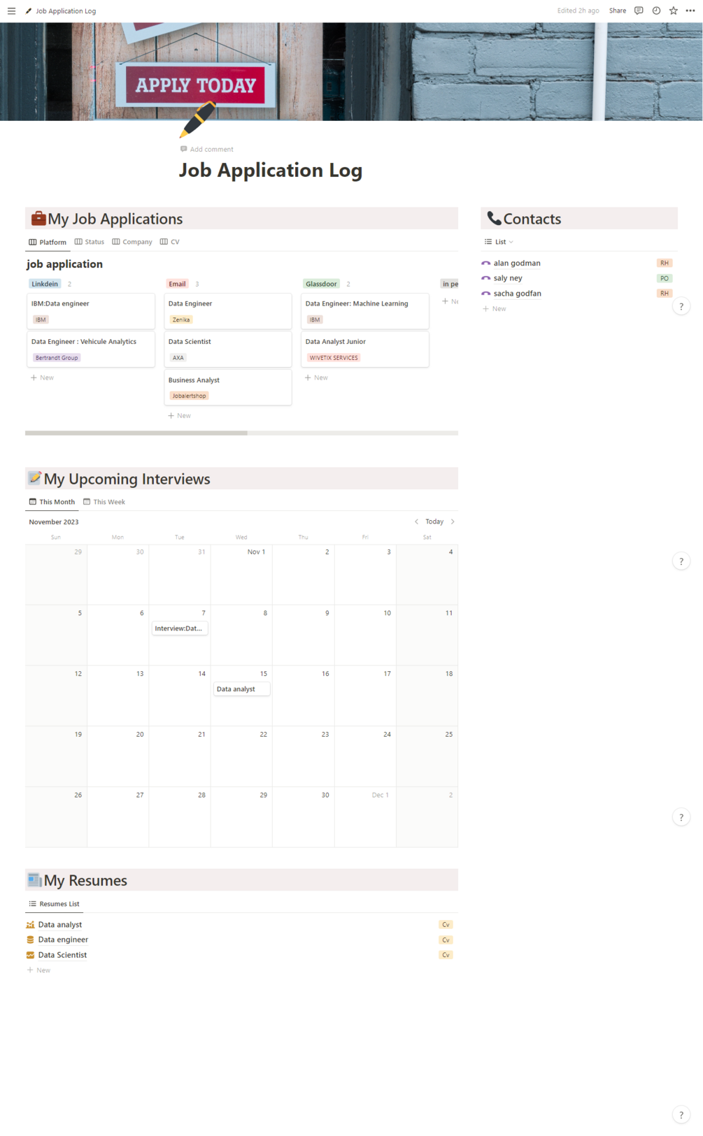 Contacts: Preserve and track professional contacts you want to keep for future reference. This section helps you maintain your network effectively